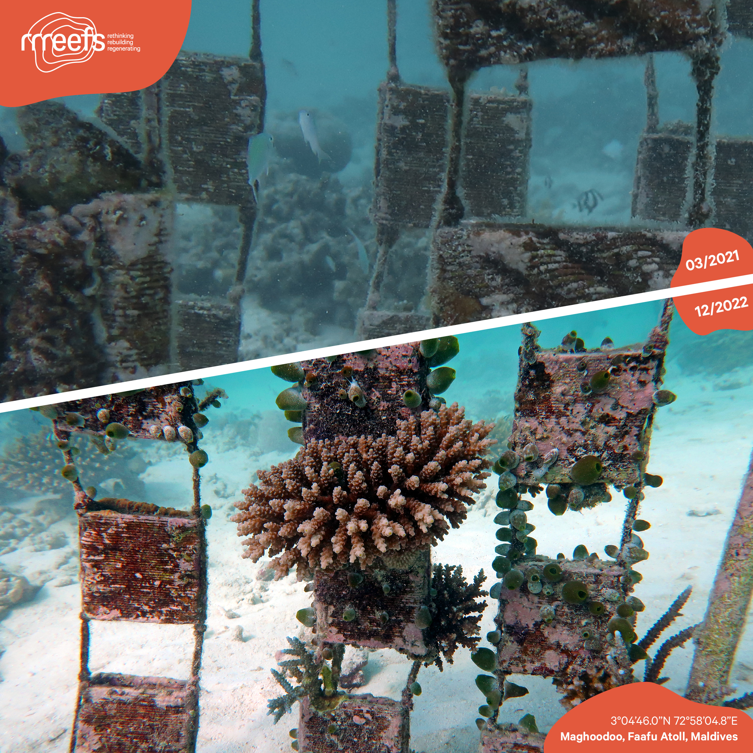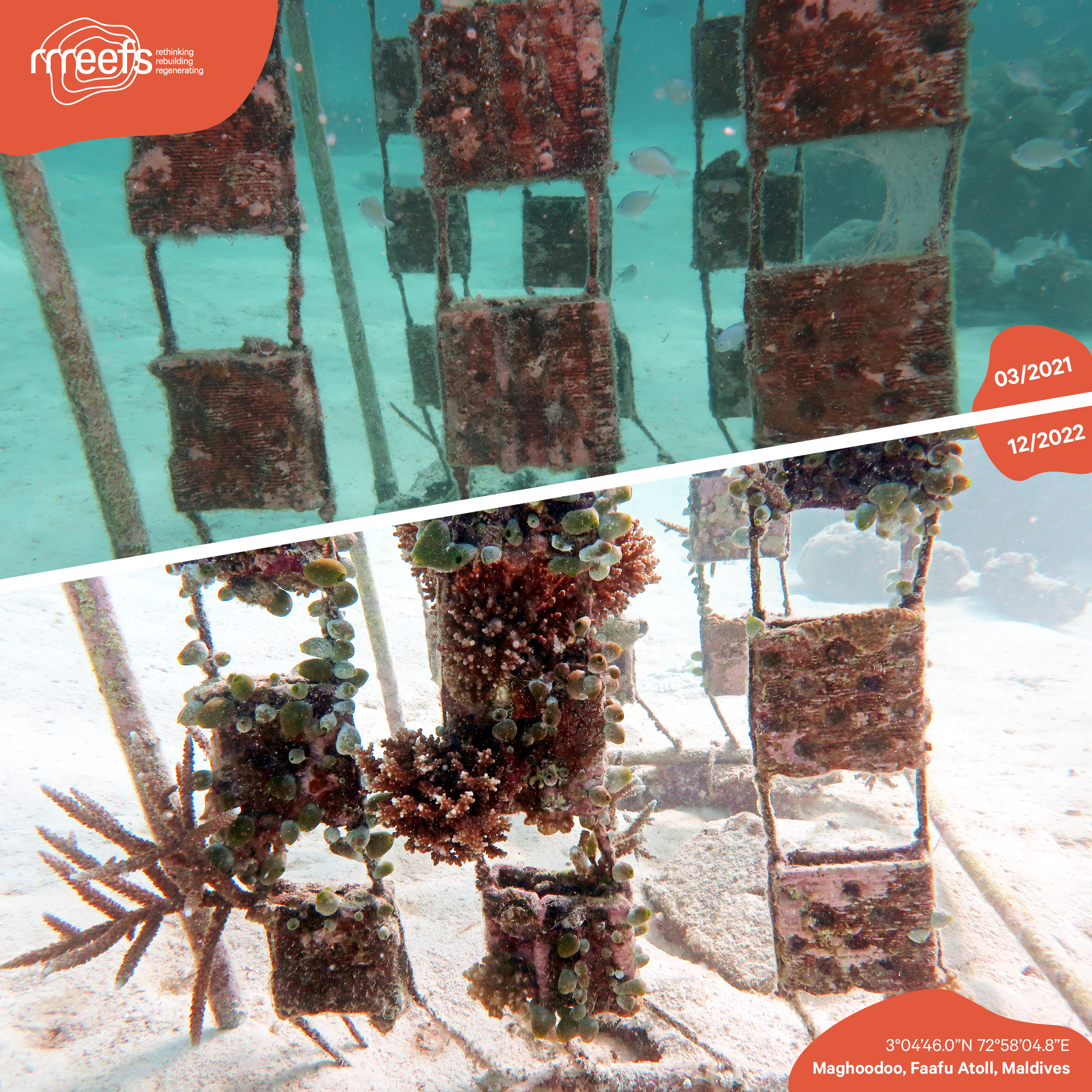 Our rrreefs journey began in 2019 off the coast of Magoodhoo Island in Fafoo Atoll, where we hung our first tiles, underwater, to test the material and surface topography of our bricks. Now three years later, we couldn’t be more proud of our work.